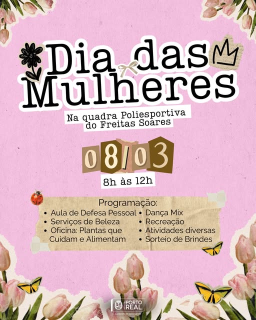 Em celebração ao Dia Internacional das Mulheres, a Prefeitura de Porto Real preparou uma manhã especial com atividades voltadas ao bem-estar, cuidado e valorização das mulheres. No dia 08 de março, das 8h às 12h, na quadra poliesportiva do Freitas Soares, teremos aula de defesa pessoal, dança mix, serviços de beleza, oficinas, recreação, atividades diversas e sorteio de brindes. Participe e venha celebrar este momento dedicado a quem inspira, transforma e fortalece nossa cidade todos os dias.