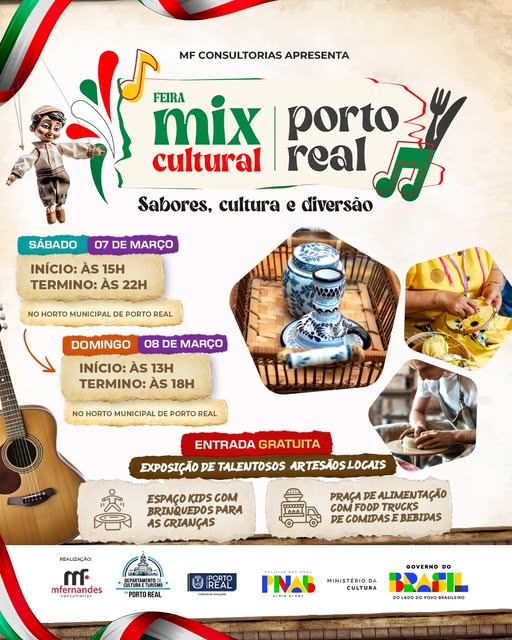 Vem aí a Feira Mix Cultural de Porto Real, um evento feito para toda a família. Anote na agenda: Sábado (07/03): das 15h às 22h. Domingo (08/03): das 13h às 18h. Local: Horto Municipal de Porto Real. Entrada GRATUITA. Venha aproveitar o melhor do artesanato, da gastronomia e da música local!