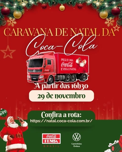 No dia 29 de novembro, a tradicional Caravana de Natal da Coca-Cola passará pela nossa cidade, espalhando encanto, alegria e o clima especial que marca essa época do ano. A partir das 16h30, nossas ruas receberão o caminhão iluminado e toda a atmosfera natalina que o acompanha, passando por diversos bairros da cidade. Este ano, a rota inicia na Fábrica da Coca-Cola e segue pelos bairros Nova Colônia, Centro, Jardim Real, Vila Real, Village, Novo Horizonte e Colinas. Depois, a caravana continua pela Av. Fernando Bernardelli até a Av. B, no Freitas Soares, passando pelo Fátima e encerrando no pórtico da cidade, no Acesso Leste, devido ao compromisso da equipe da Caravana em seguir para Volta Redonda no mesmo dia. Confira a rota completa: https://natal.coca-cola.com.br/ Vamos juntos celebrar esse momento tão especial em família.