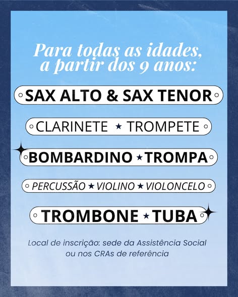 Se você gosta de música, já toca ou deseja aprender, procure a Secretaria e participe. As vagas são para os seguintes instrumentos: sax alto, sax tenor, clarinete, trompete, trombone, bombardino, trompa, tuba, percussão, violino e violoncelo.